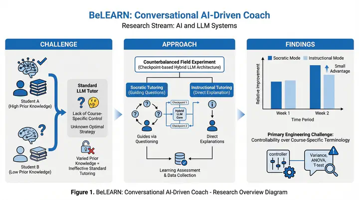 The project built a course-specific conversational AI tutor for an introductory statistics course at the University of Bern. The system used a checkpoint-based hybrid architecture that combined hard-coded constraints for terminology, references, and forbidden paraphrases with generative LLM components. This approach enforced strict adherence to course-specific notation (for example, exact use of partial eta-squared notation and specific R package arguments) while keeping the dialogue adaptive to different student paths. The tutor was deployed in a counterbalanced two-week field experiment where students were randomly assigned to receive either the Socratic or instructional mode first and then switched.