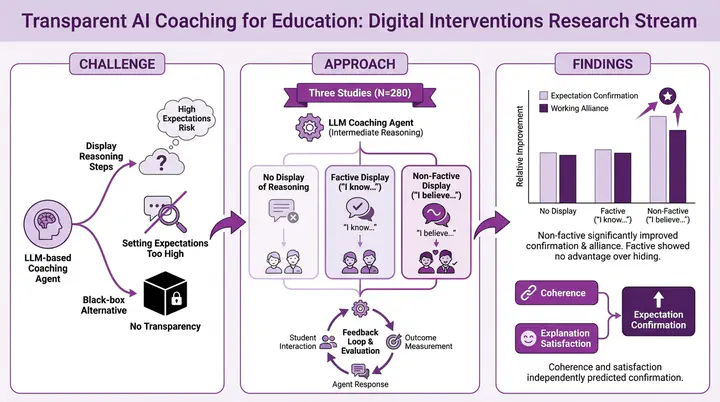 The project conducted controlled experiments and real-world field studies with university students who interacted with an AI-based coaching system over the course of a semester. The experimental conditions varied along two dimensions: whether the AI displayed its intermediate reasoning steps to the user, and how that reasoning was framed. The “factive” framing used assertive language (“I know that…”), while the “non-factive” framing used epistemically humble language (“I believe that…”). The studies measured user trust, expectation confirmation, working alliance (the perceived quality of the coach-user relationship), and academic outcomes.